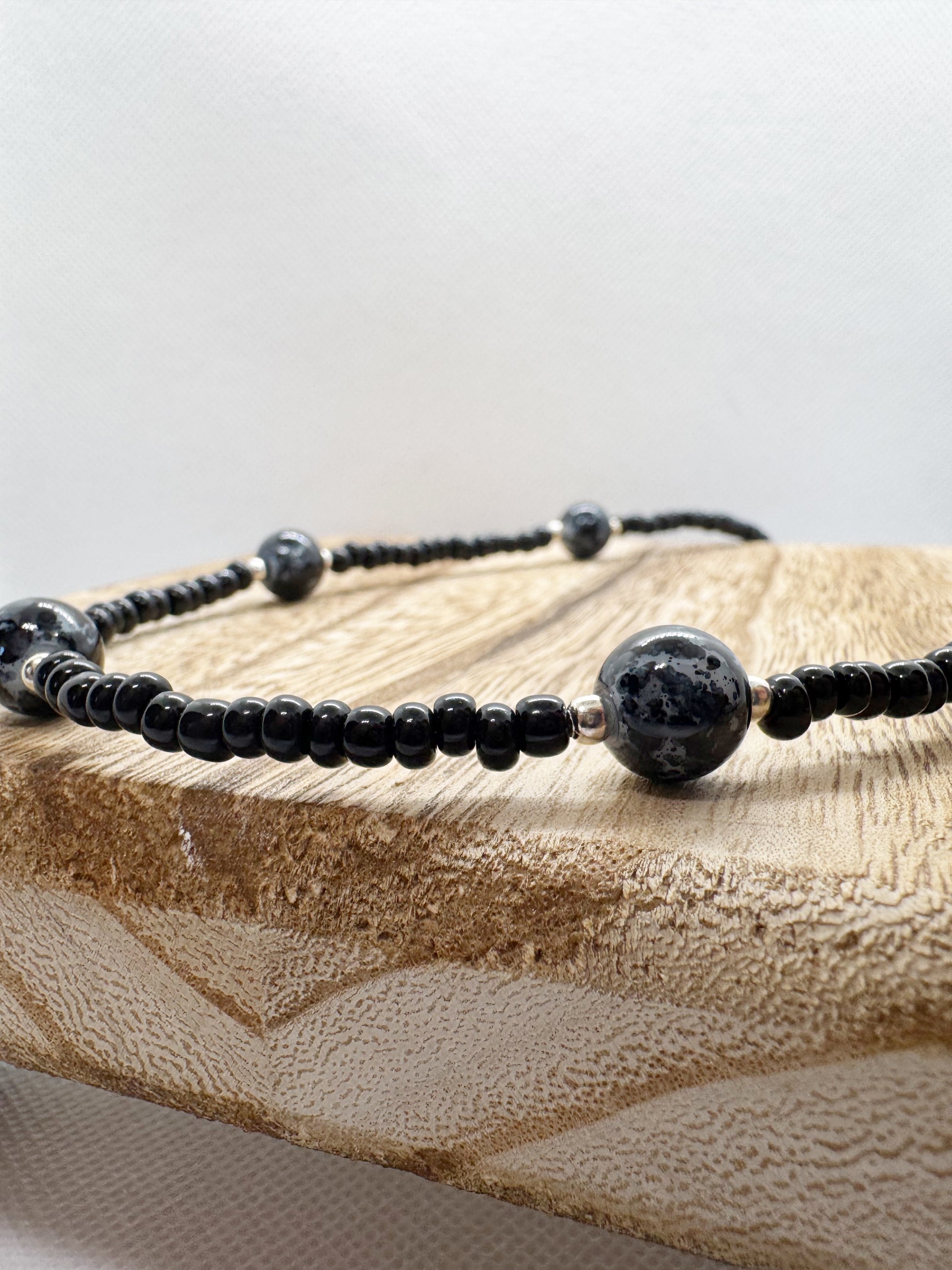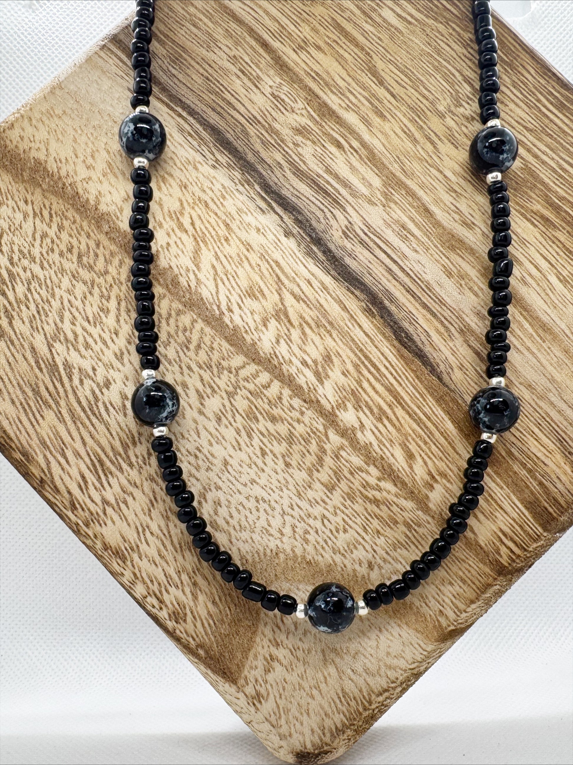 This statement necklace features sleek black beads accented by striking obsidian rounds and subtle silver details. Its bold and modern design brings a touch of mystery and elegance to any outfit