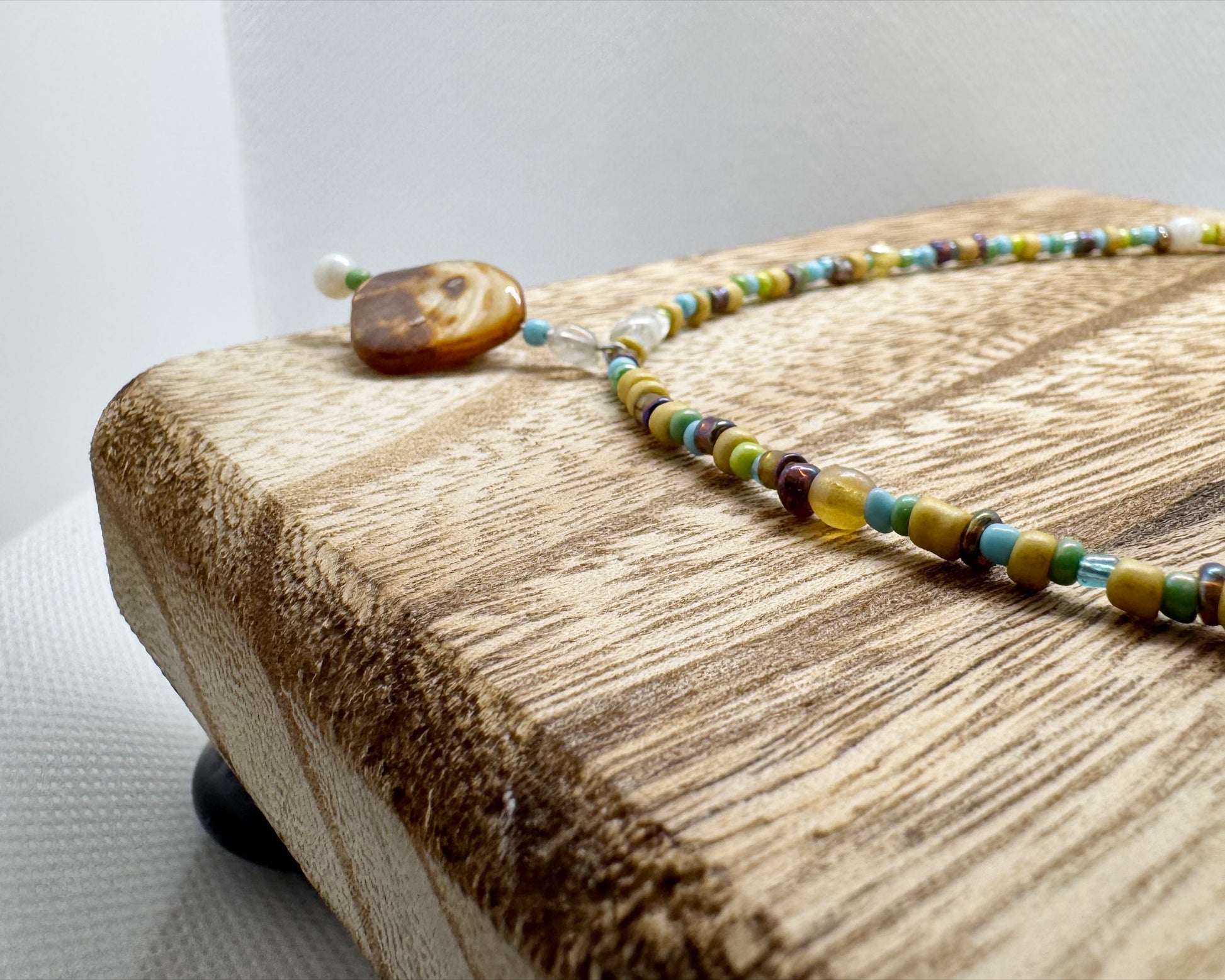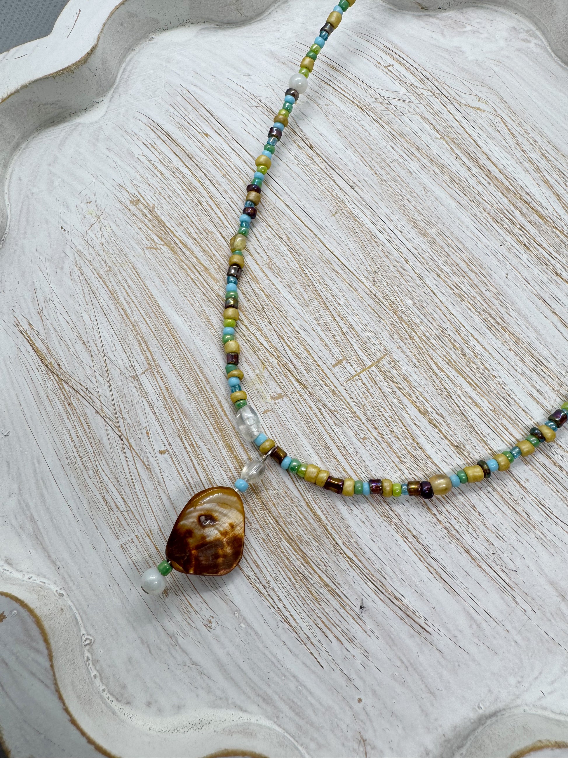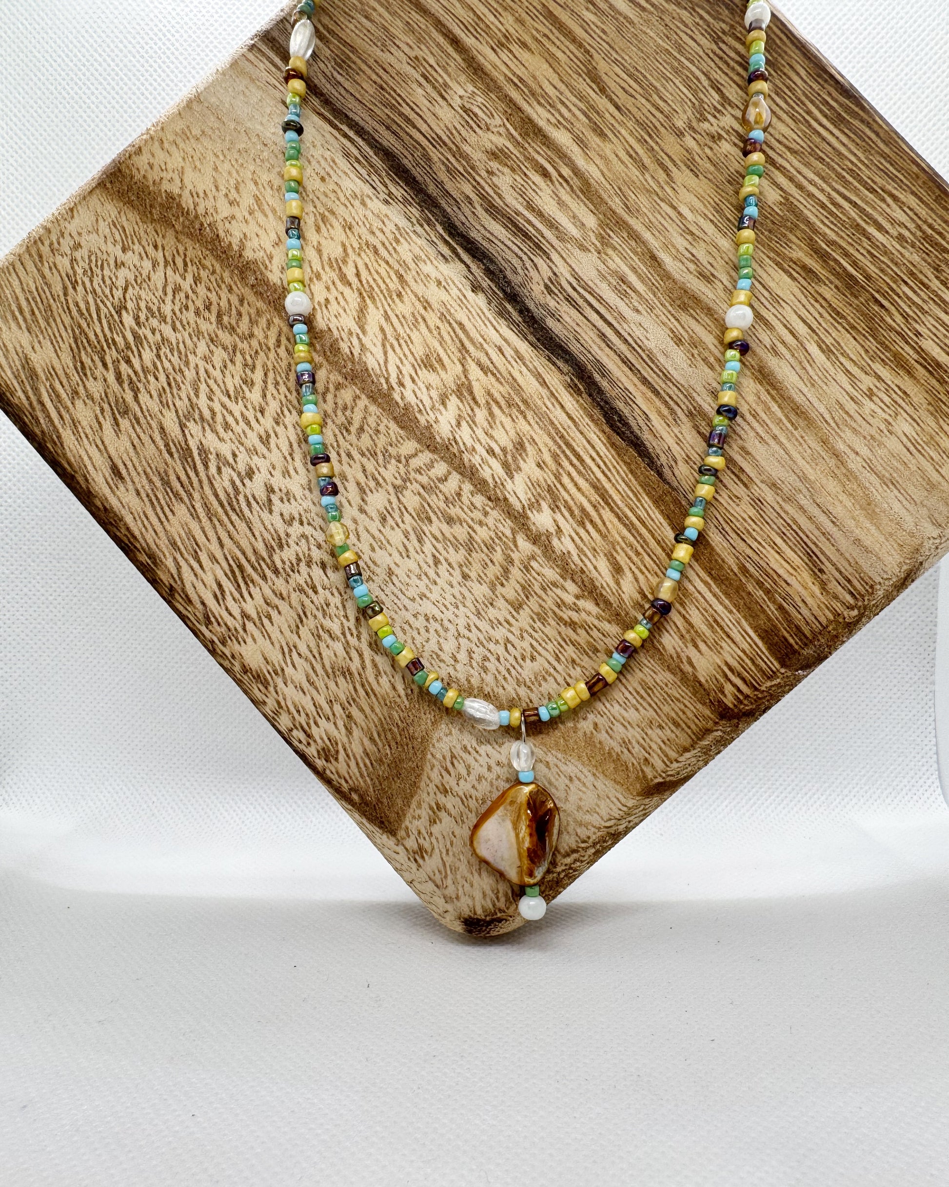 This necklace features a vibrant array of small, multicolored beads interspersed with pearlescent accents. At its center hangs a unique pendant paired with additional white beads, giving it a beachy, earthy charm. The piece exudes a playful and bohemian style suitable for both summer and fall.