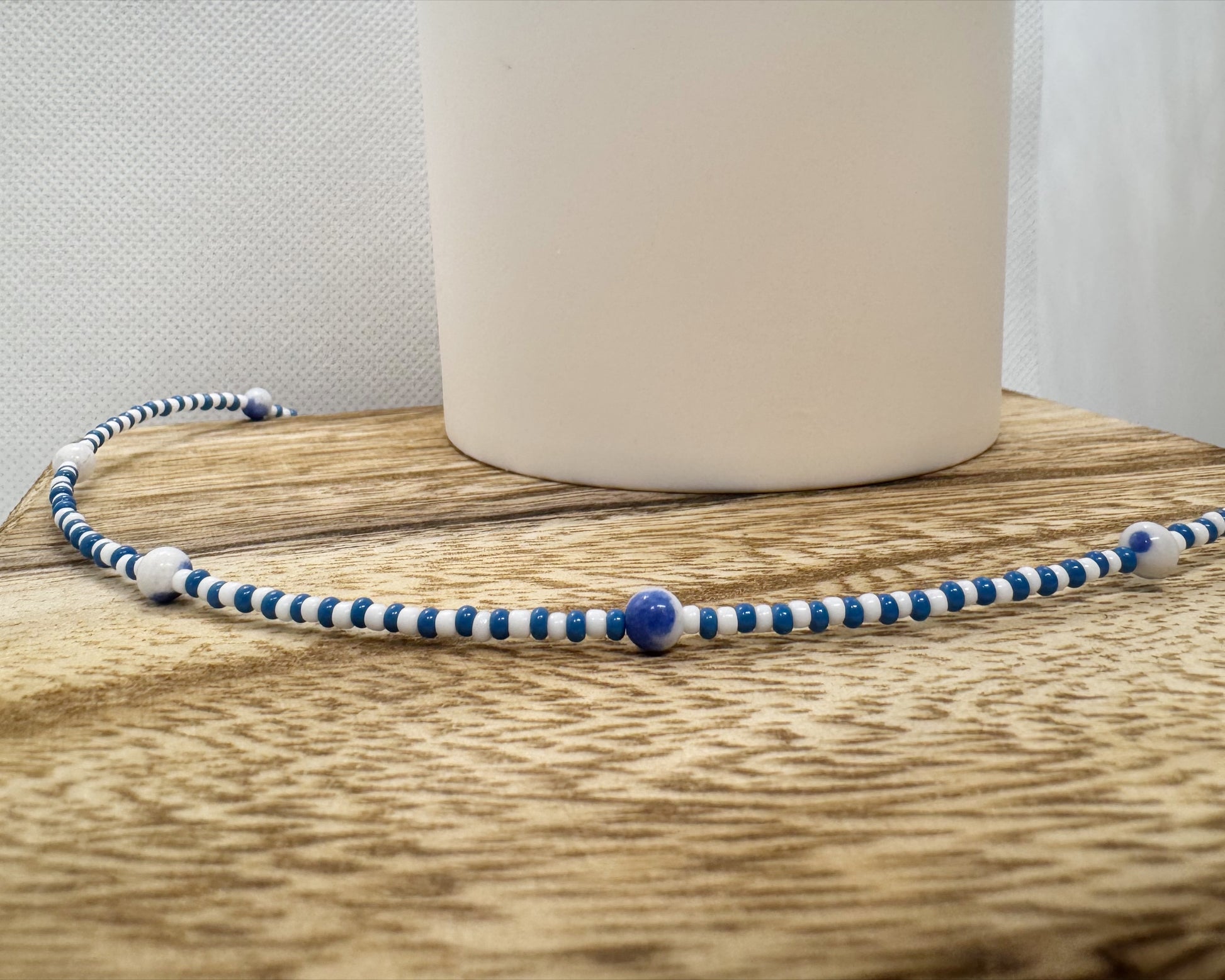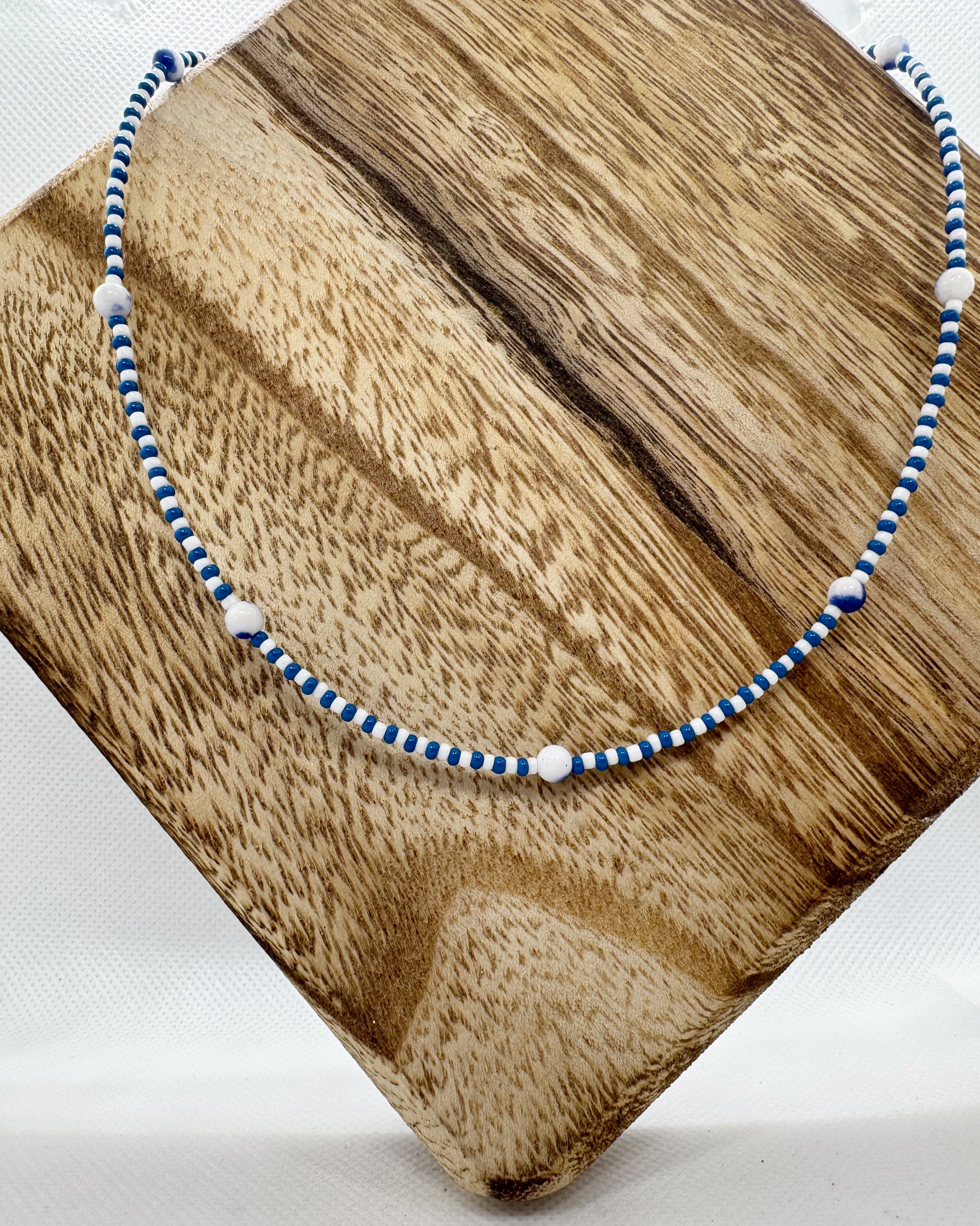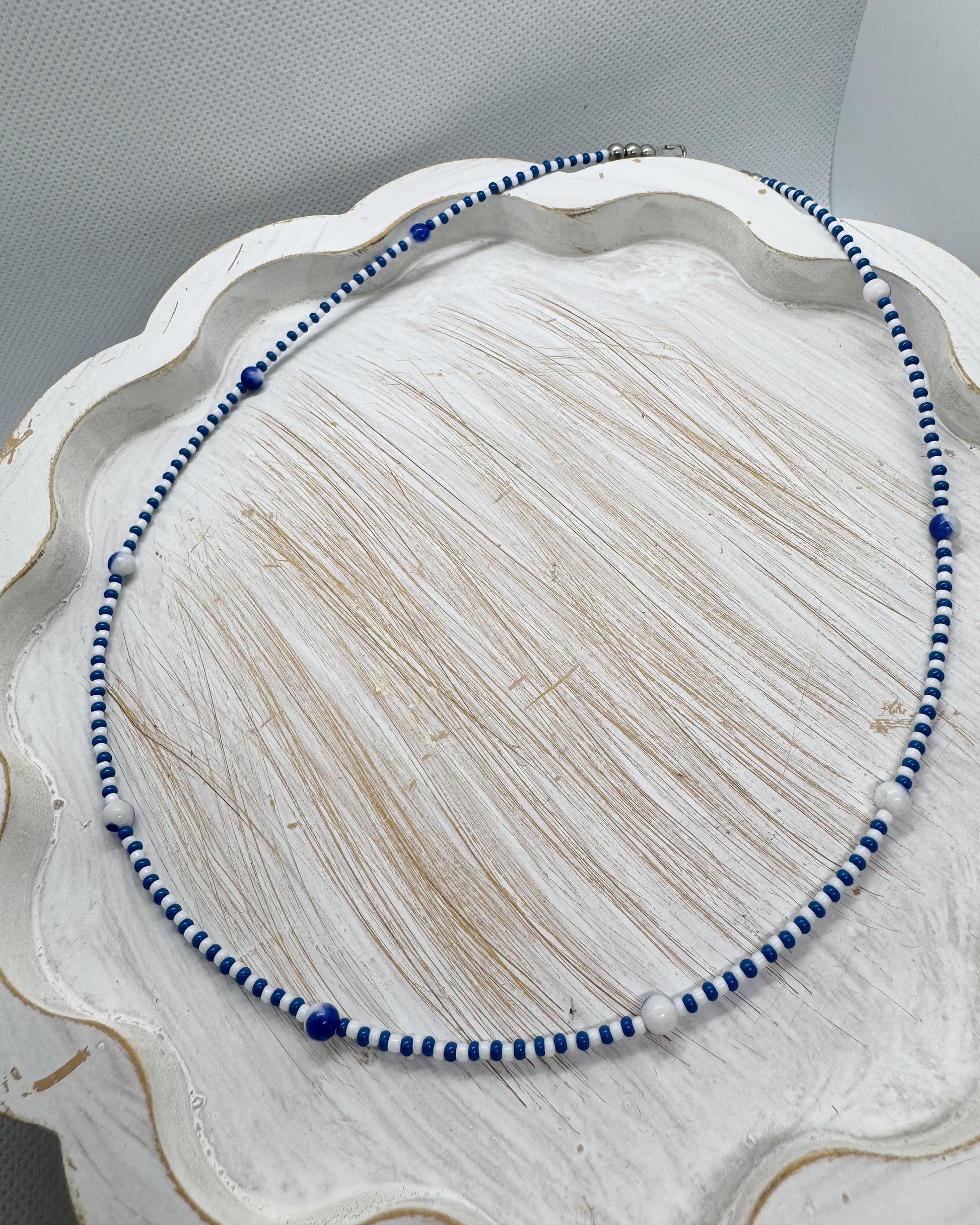 This necklace is crafted with alternating deep blue and white seed beads, accented by slightly larger blue and white round beads spaced along the strand. Its simple and clean color palette creates a classic look that’s both versatile and stylish, perfect for everyday wear or pairing with nautical-themed outfits