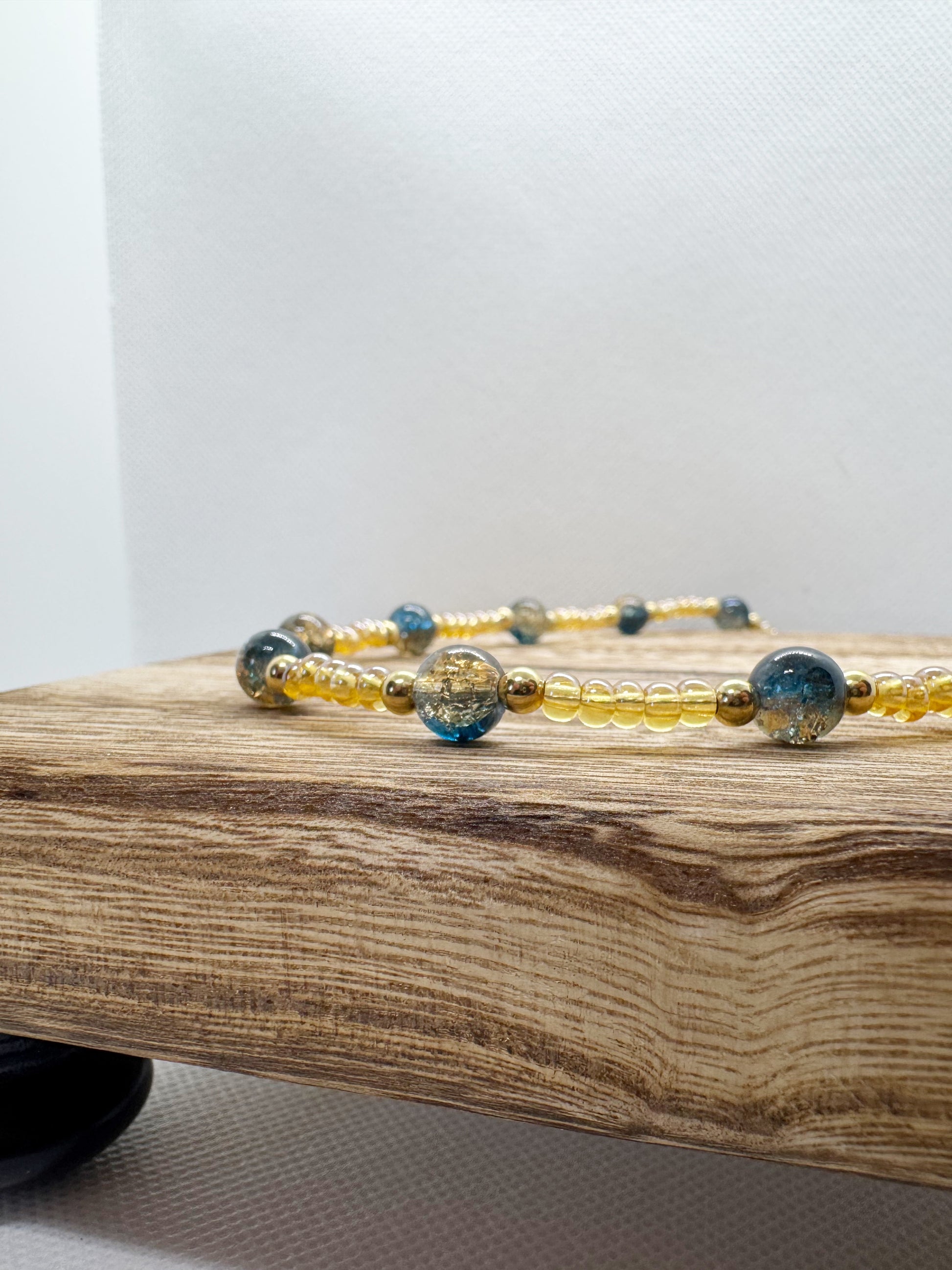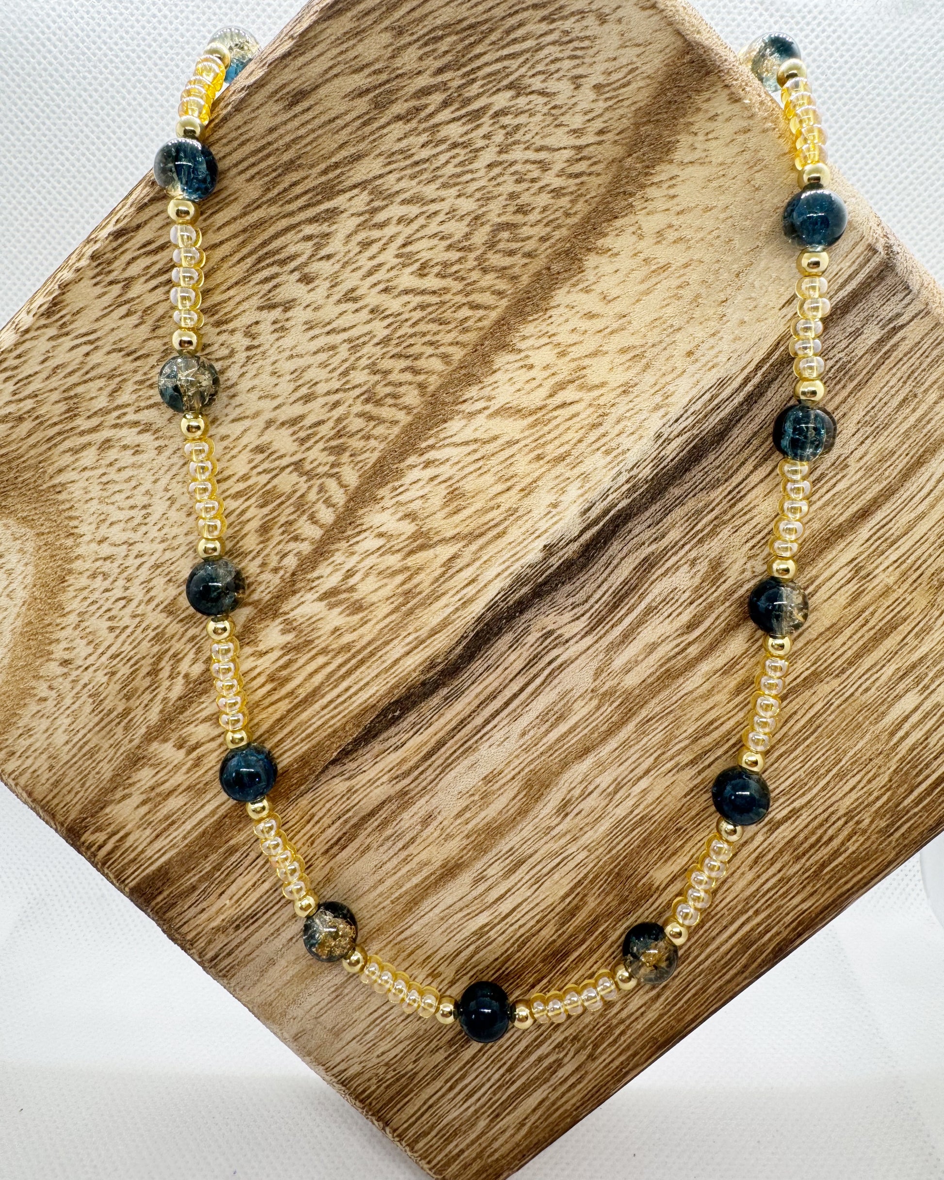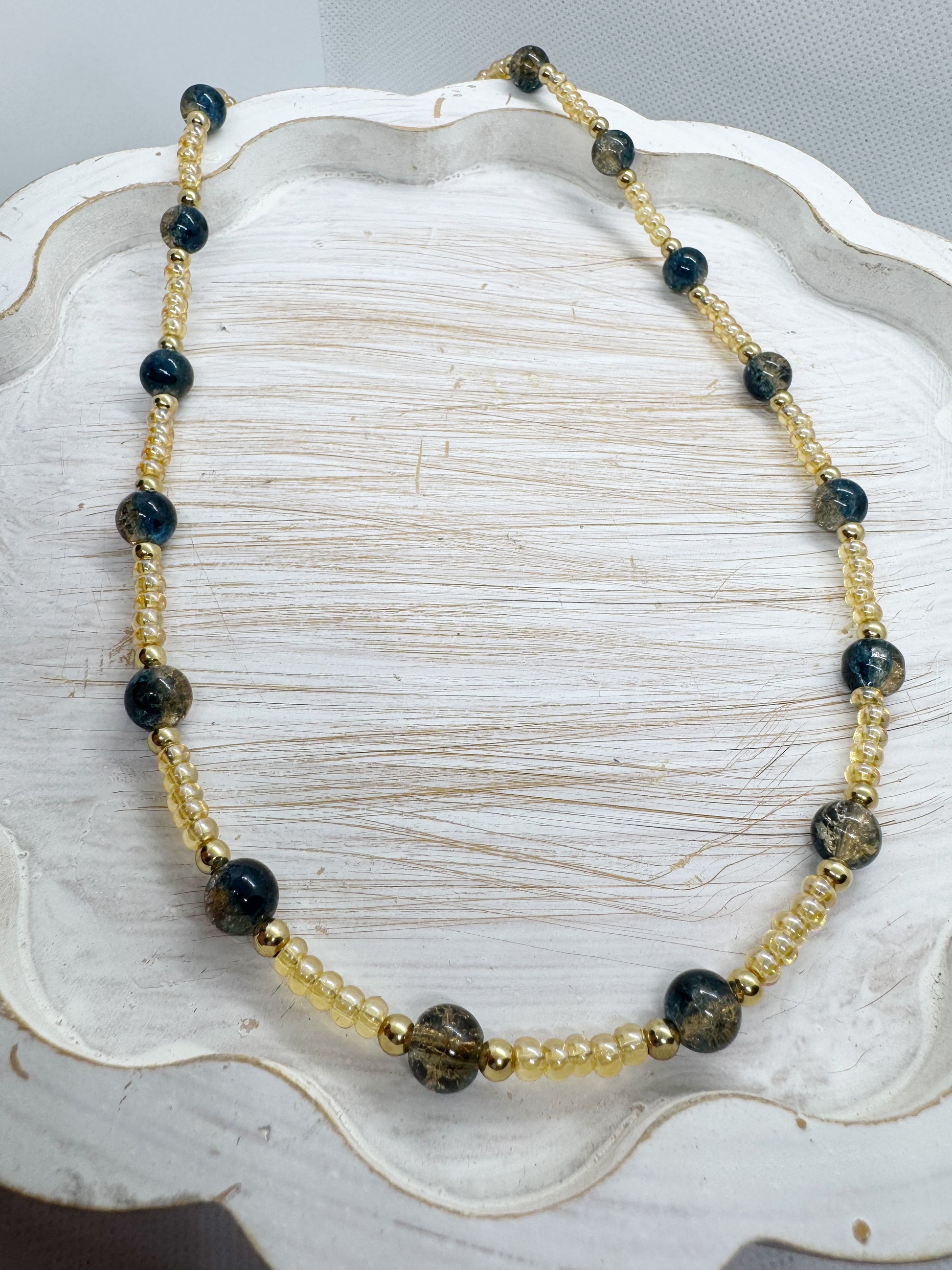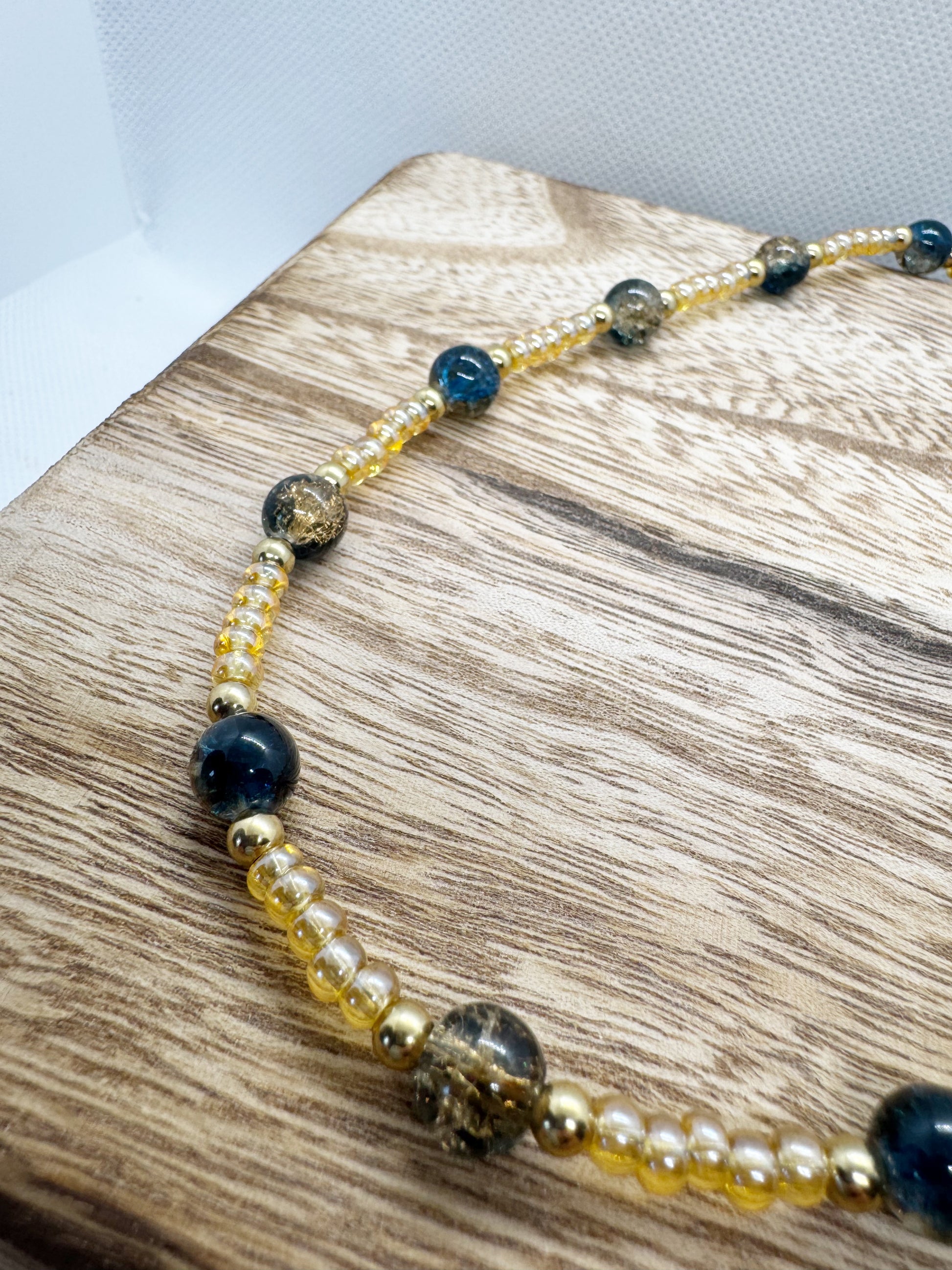 This elegant necklace pairs translucent golden beads with striking deep blue and gold-speckled round beads for a sophisticated look. Its blend of shimmering tones adds a refined touch to both casual and formal styles, making it a versatile accessory for any occasion