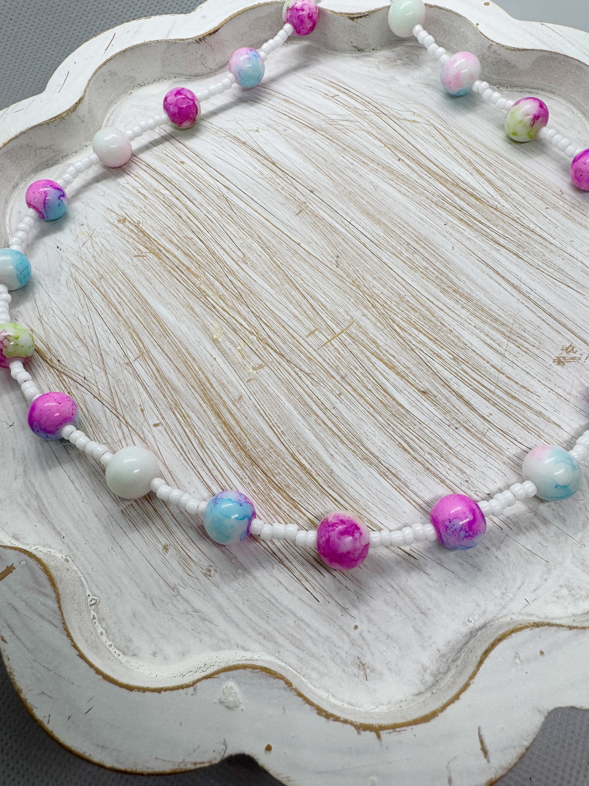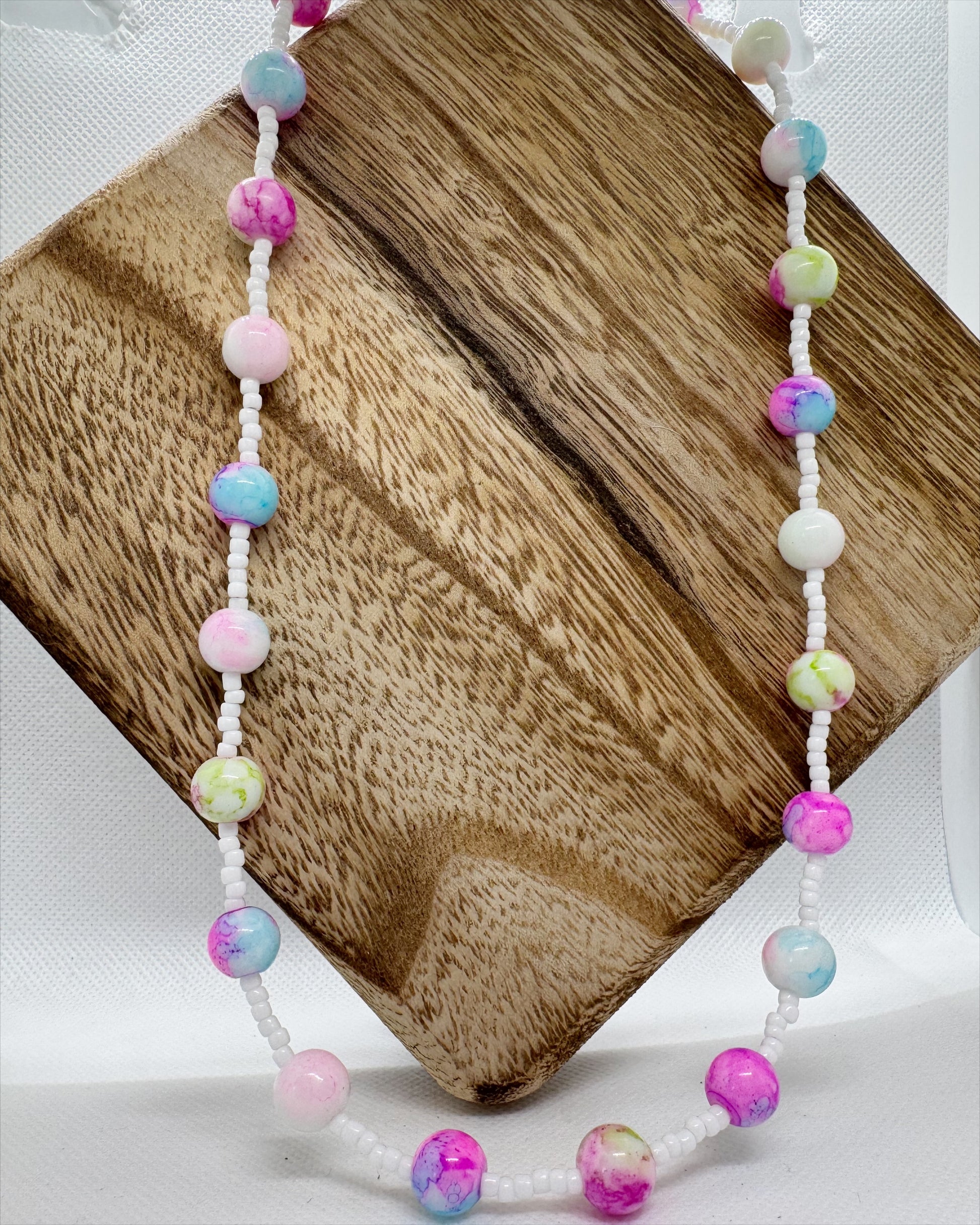 This vibrant necklace showcases glossy marble-effect beads in shades of hot pink, blue, green, and white, spaced with small white seed beads. The playful and colorful combination makes it an eye-catching accessory ideal for adding a pop of color to any casual or summer outfit.