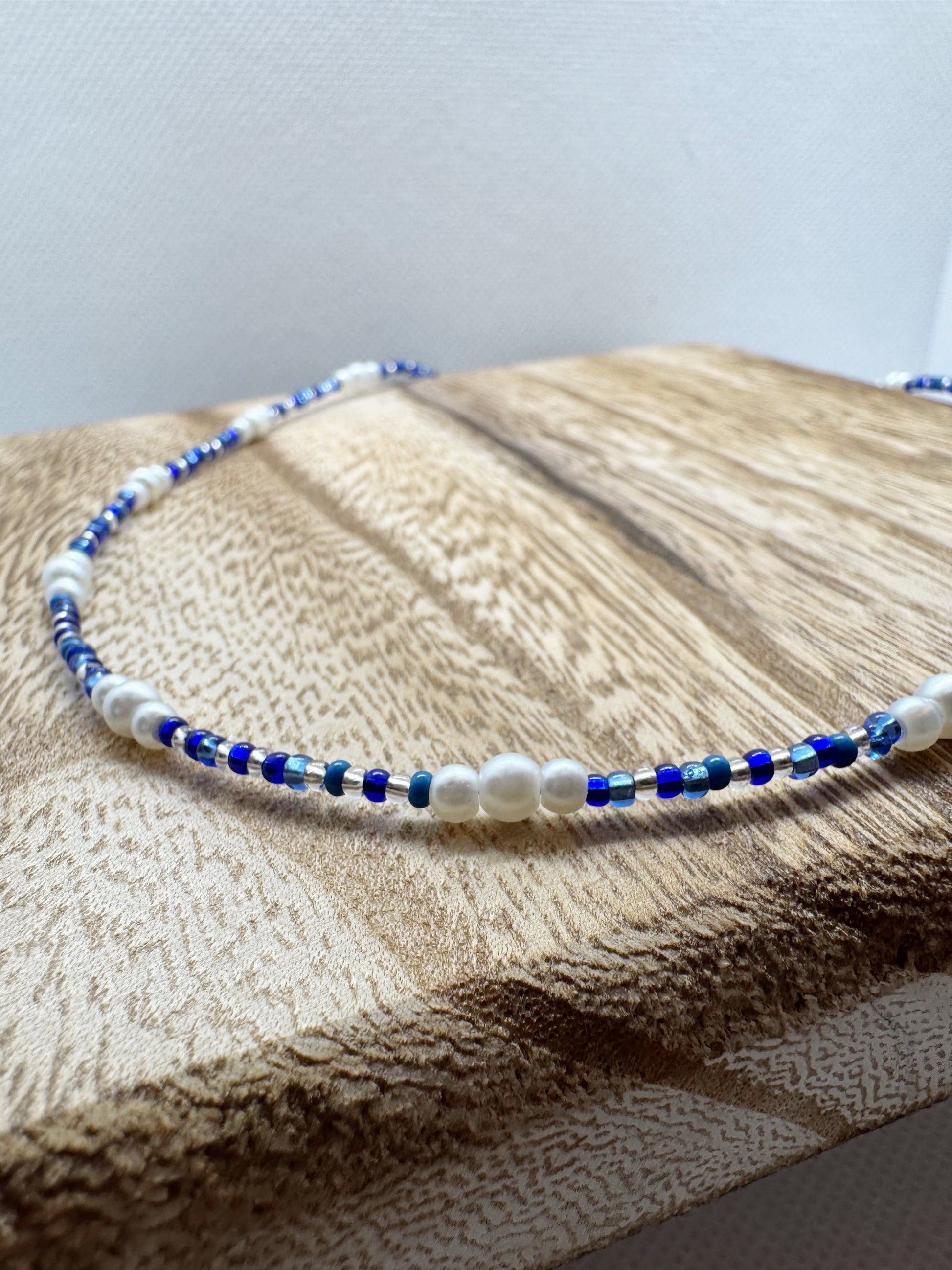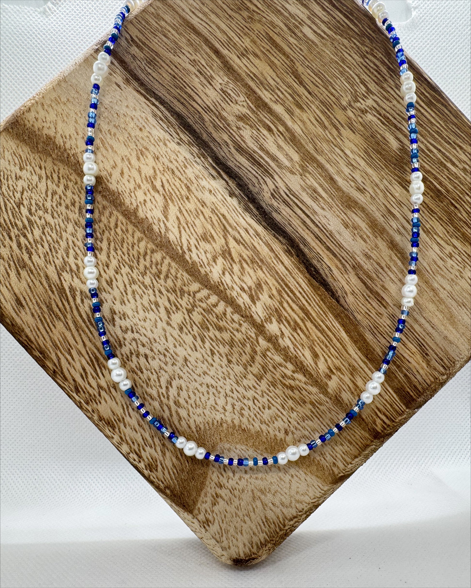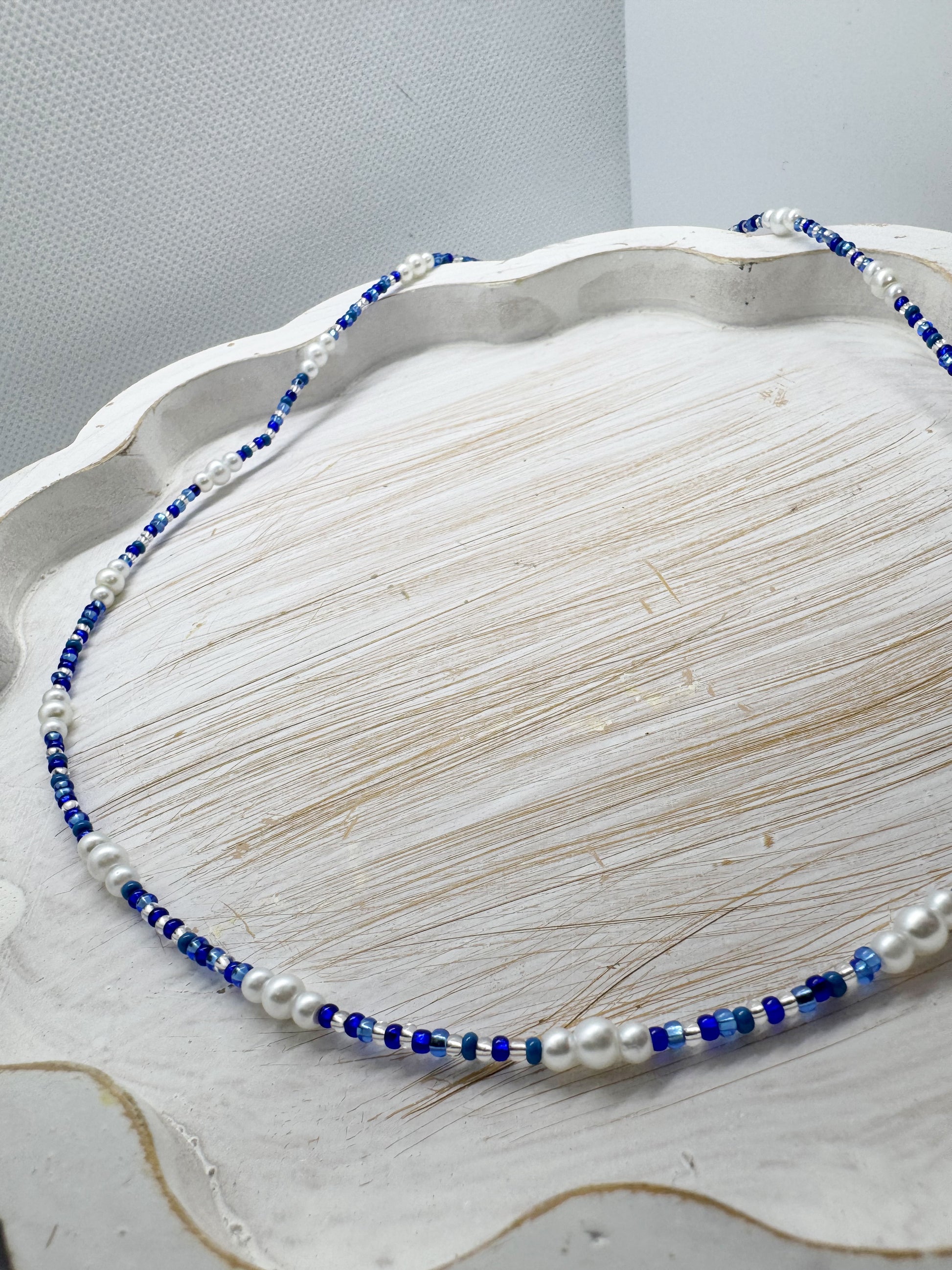 This elegant necklace combines lustrous white pearls with sparkling blue seed beads for a timeless coastal look. Its fresh color palette evokes the beauty of the ocean, adding a touch of serene sophistication to any outfit.