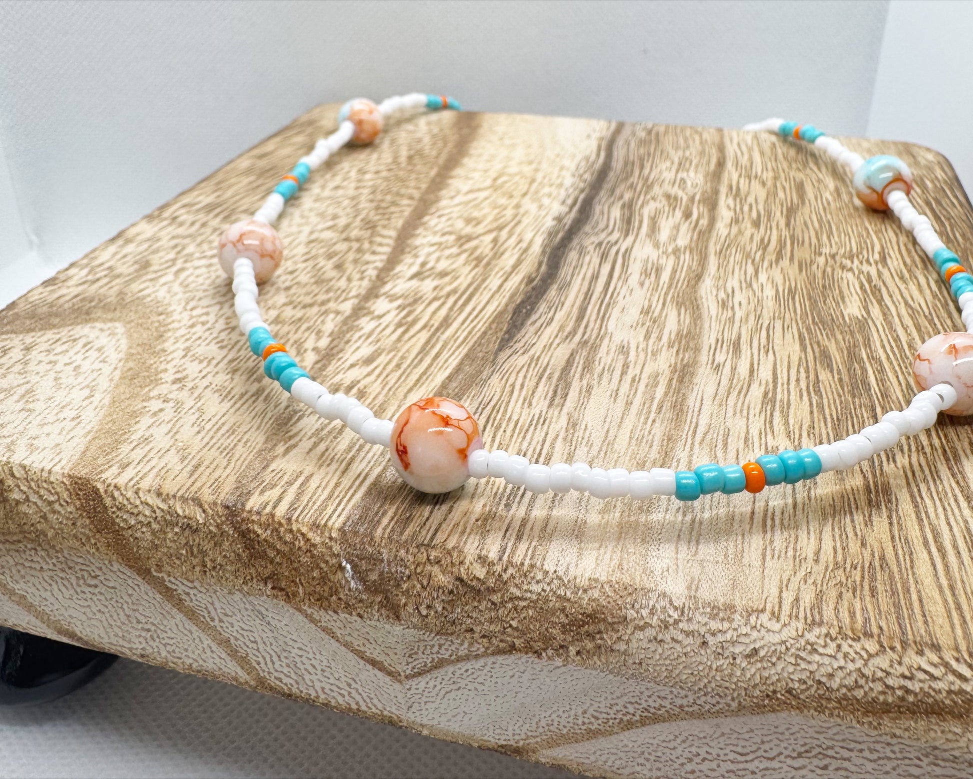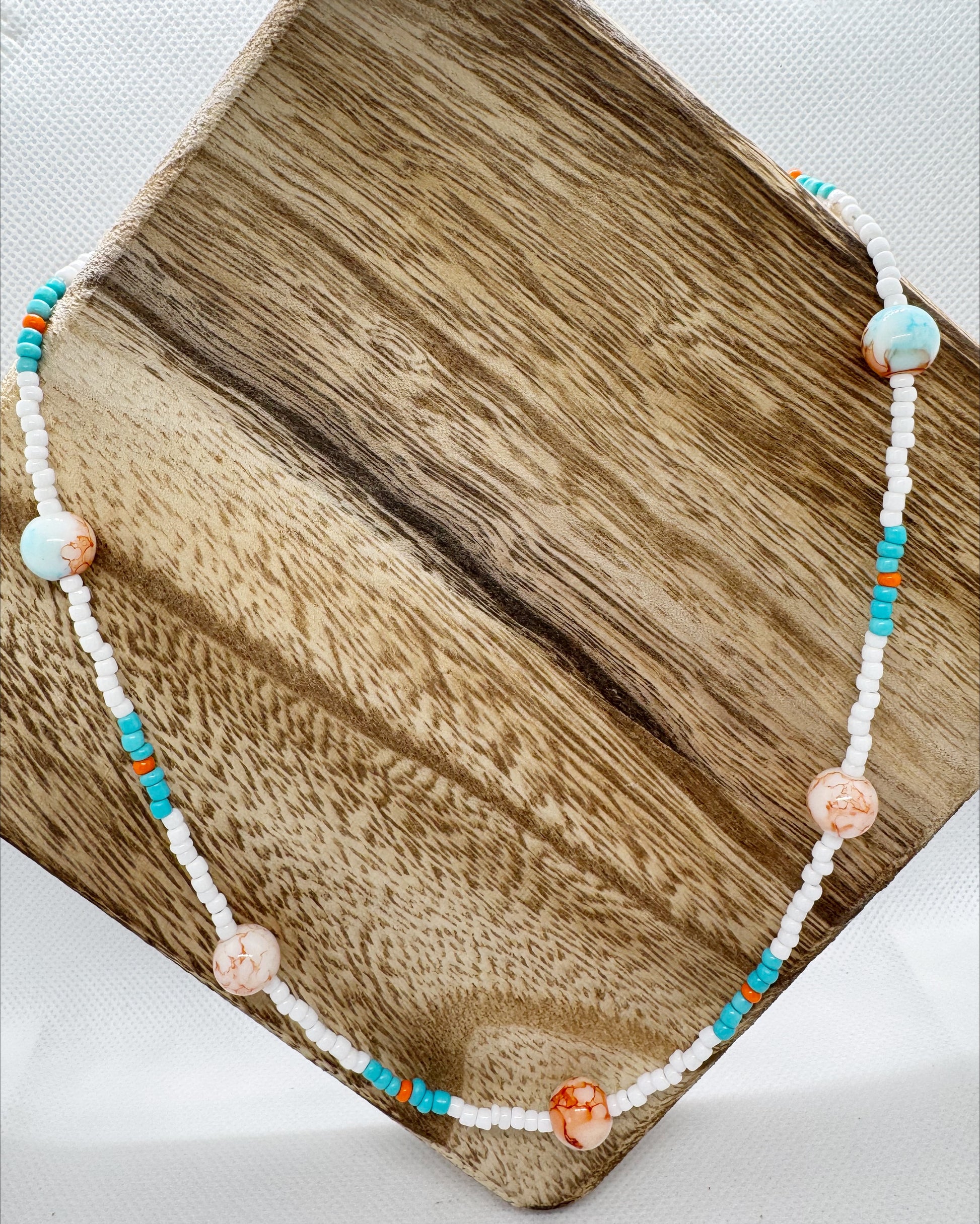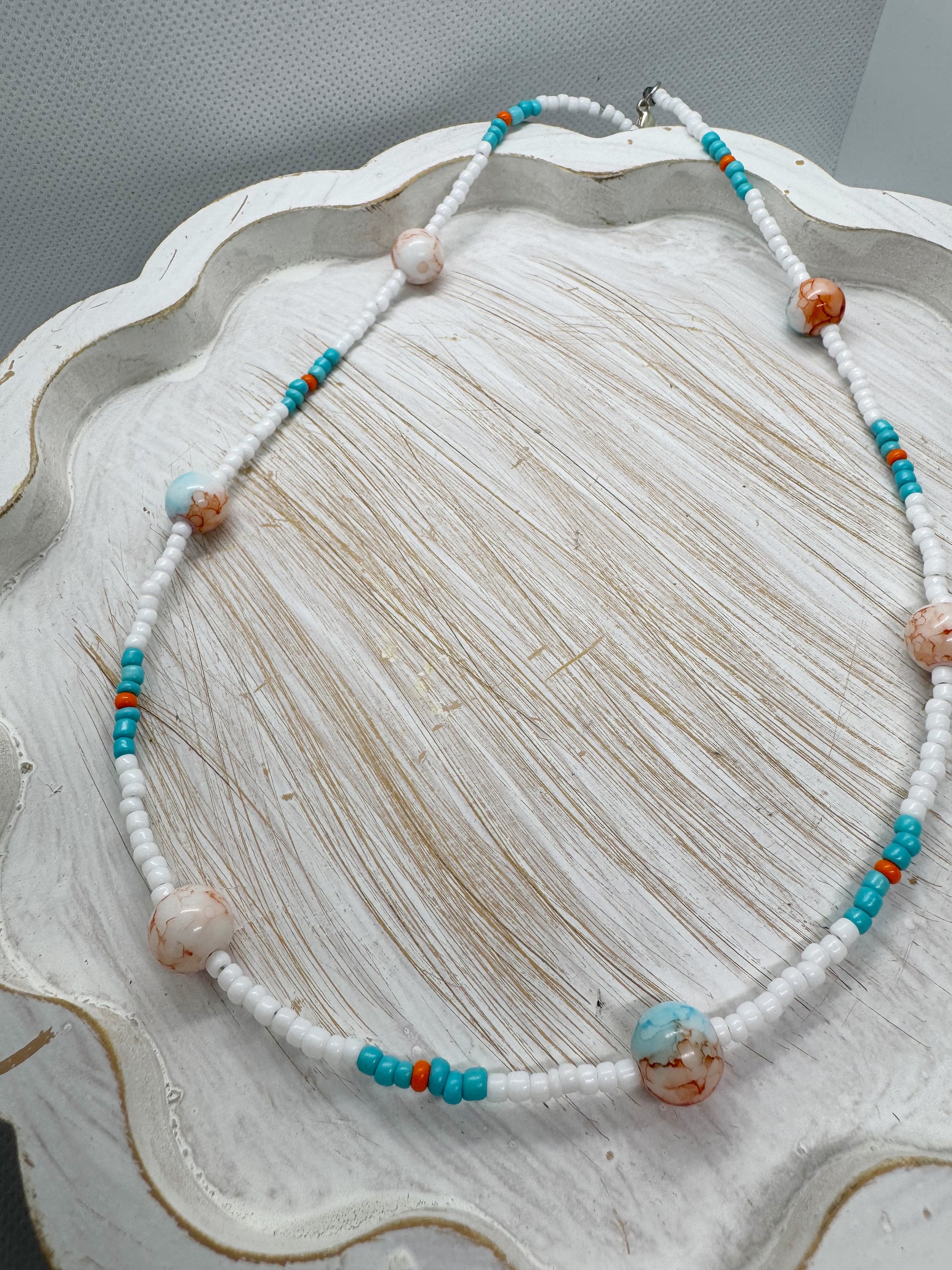 This necklace features a delicate arrangement of small white beads accented by turquoise and orange seed beads, with larger marbled beads in white and blue tones spaced evenly throughout. The soft color palette and playful beadwork create a fresh, bohemian accessory perfect for everyday wear.