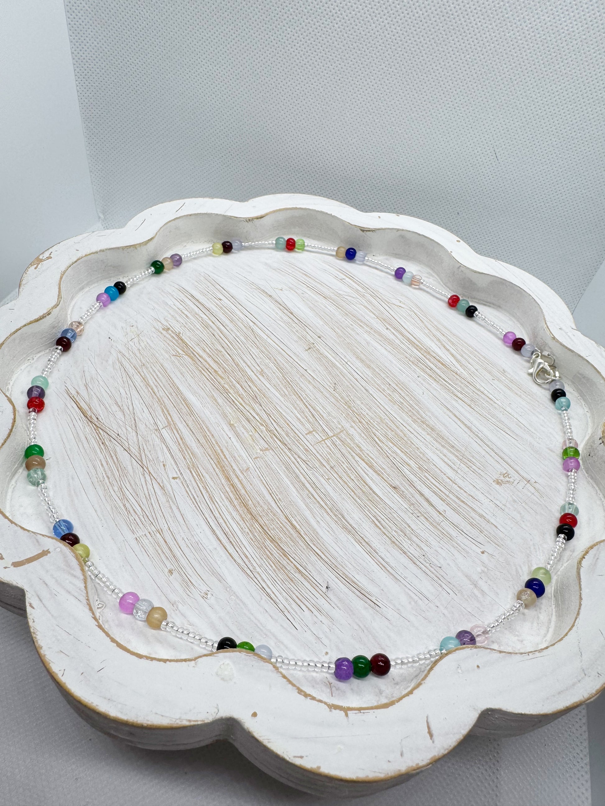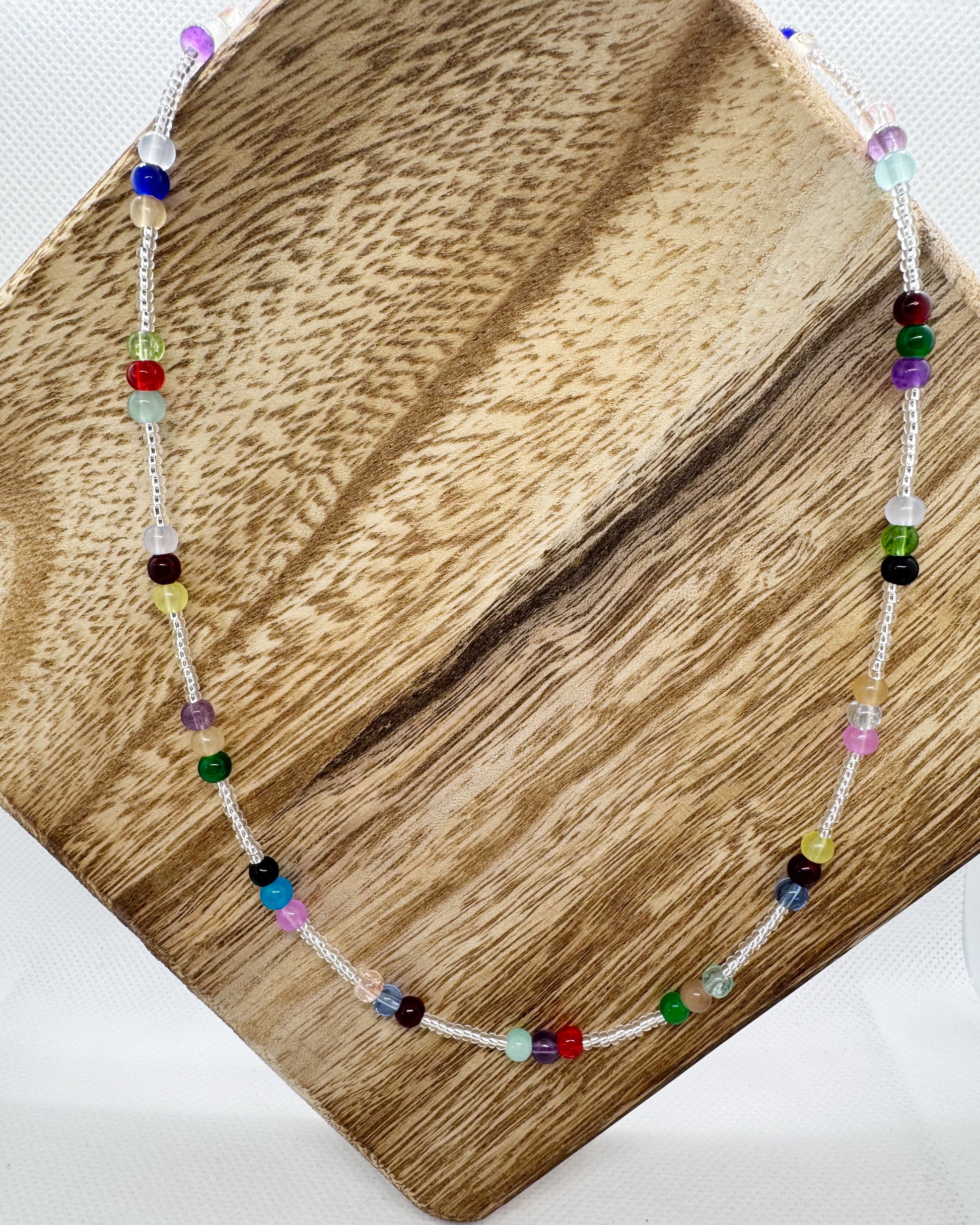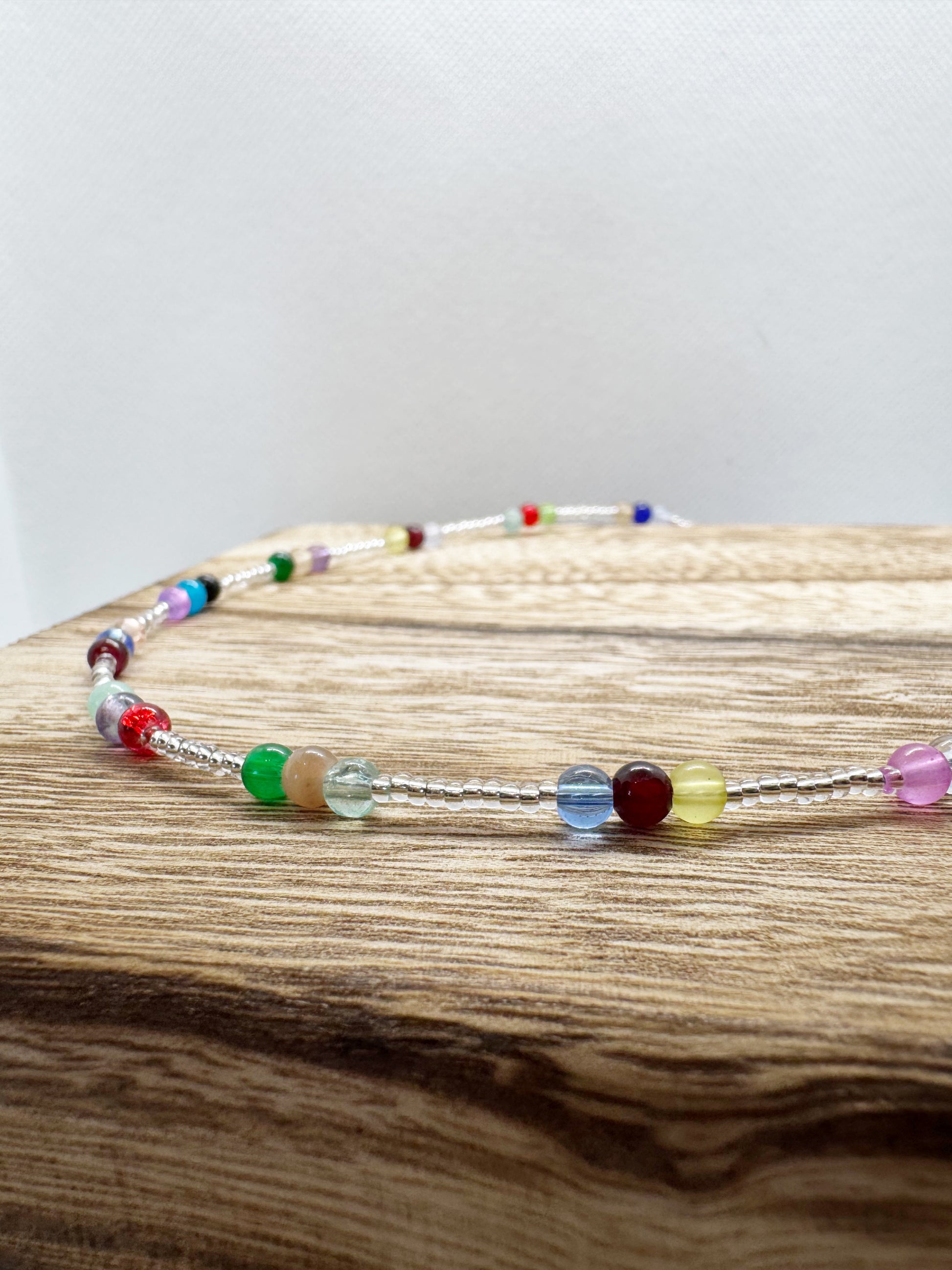 This handmade necklace features a delicate silver-toned braided chain adorned with vibrant, multicolored beads, creating a unique and playful accessory perfect for any occasion
