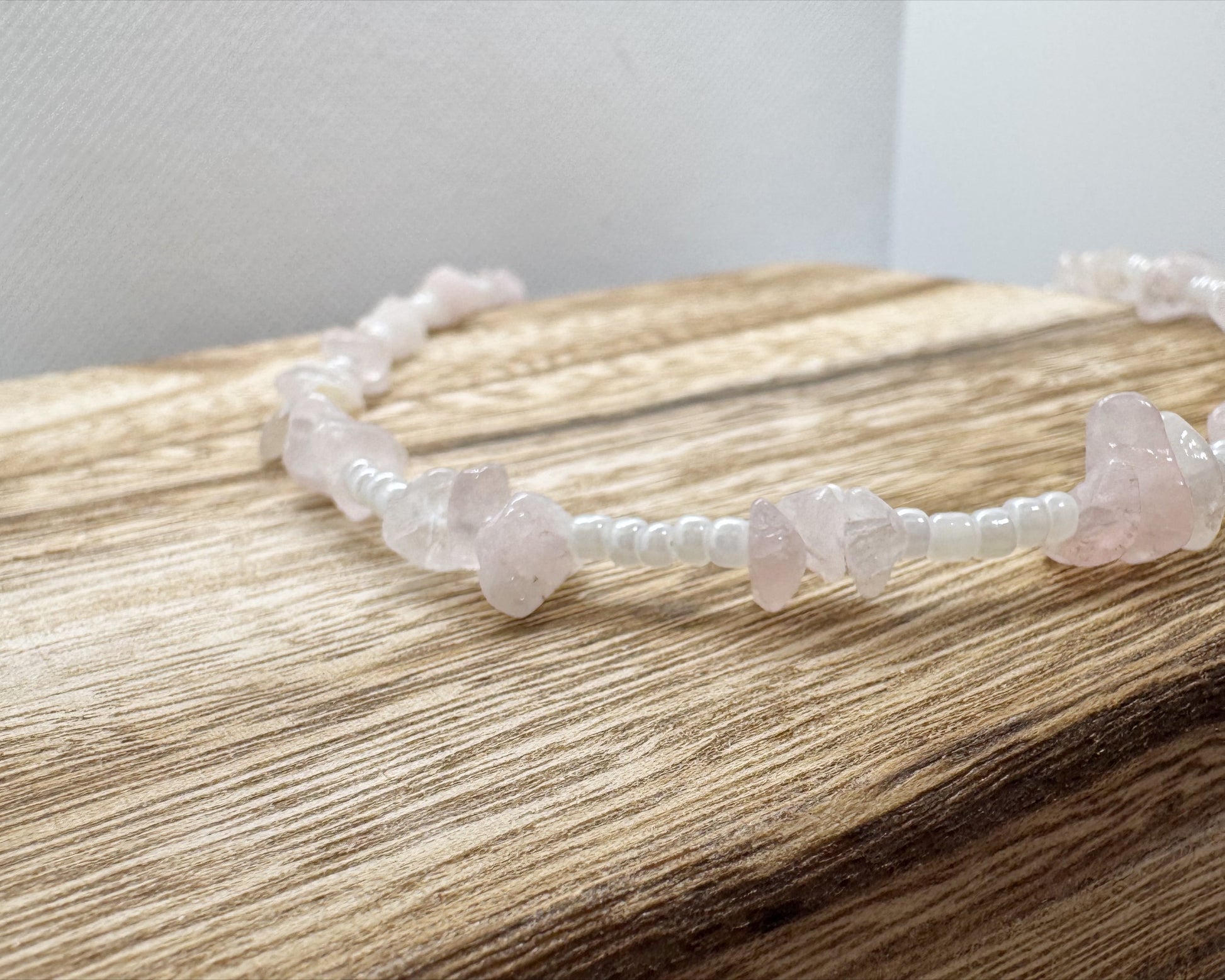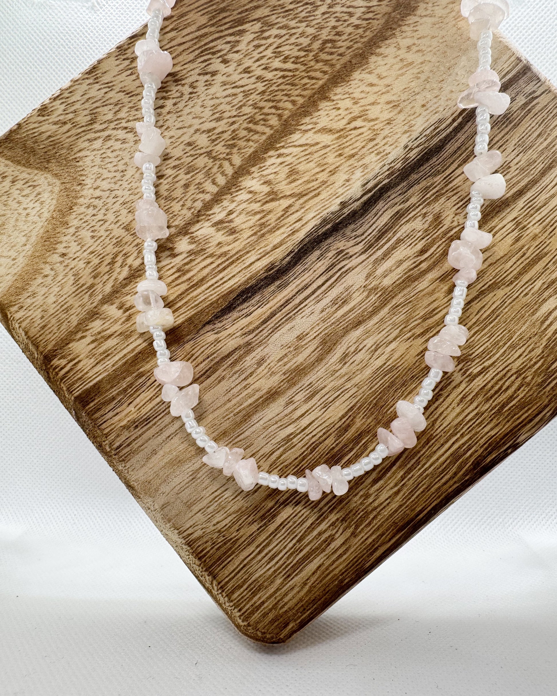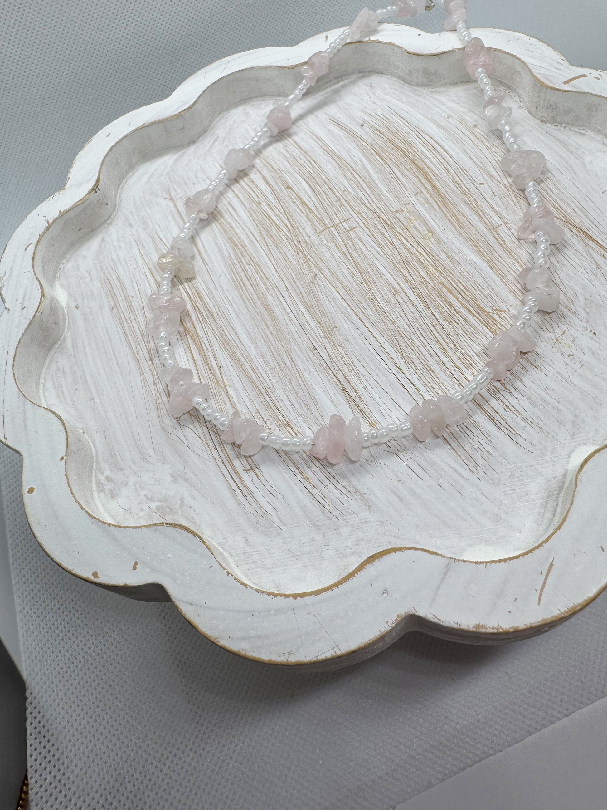 This delicate necklace showcases soft pink gemstone chips paired with tiny lustrous white beads, creating an elegant and feminine accessory. Its gentle pastel tones and natural stones make it perfect for adding a subtle touch of charm to any outfit