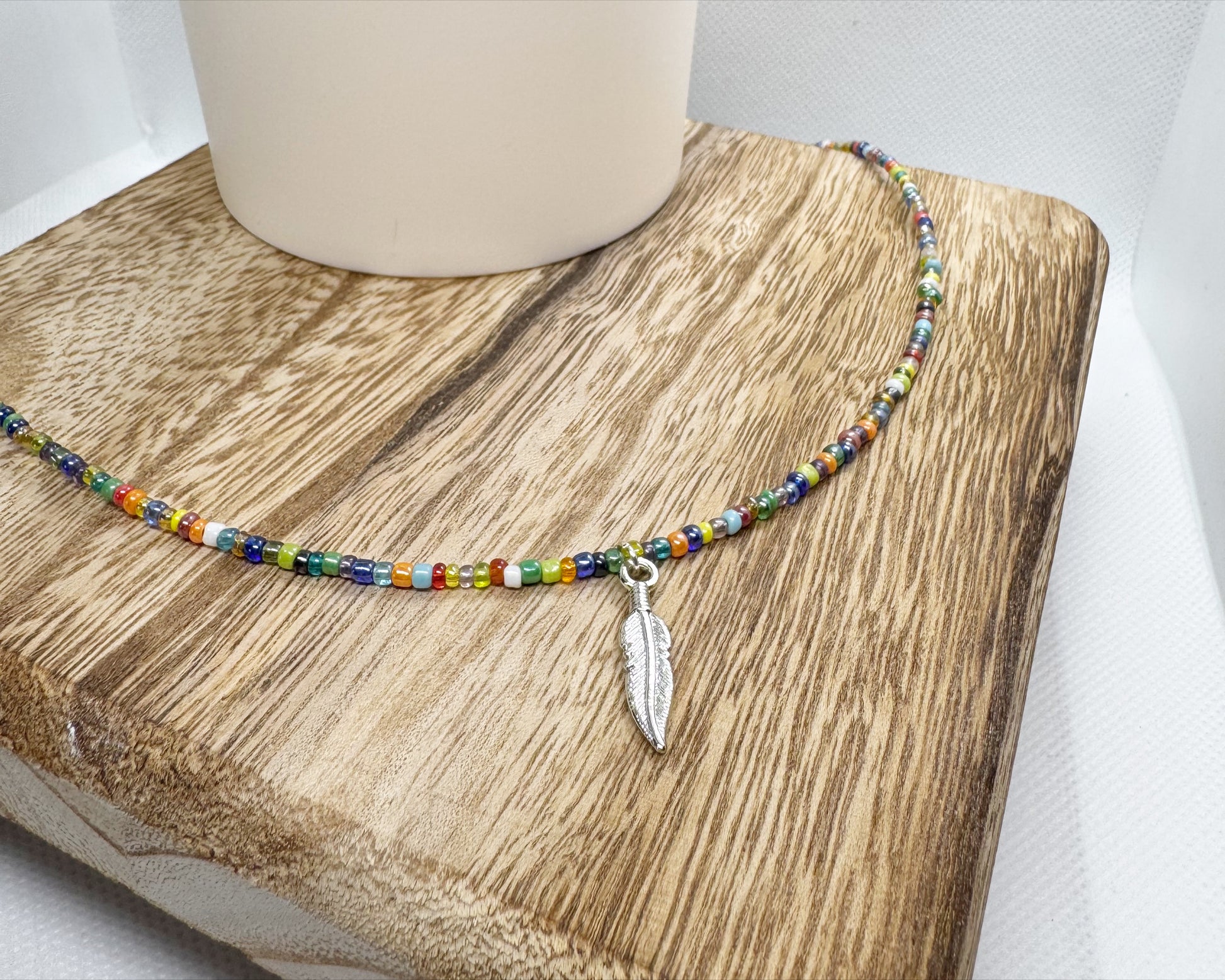 This vibrant necklace features a strand of tiny multicolored glass beads, creating a cheerful and lively look. It is accented with a small silver feather charm, adding a boho touch perfect for casual outfits or festival styles.