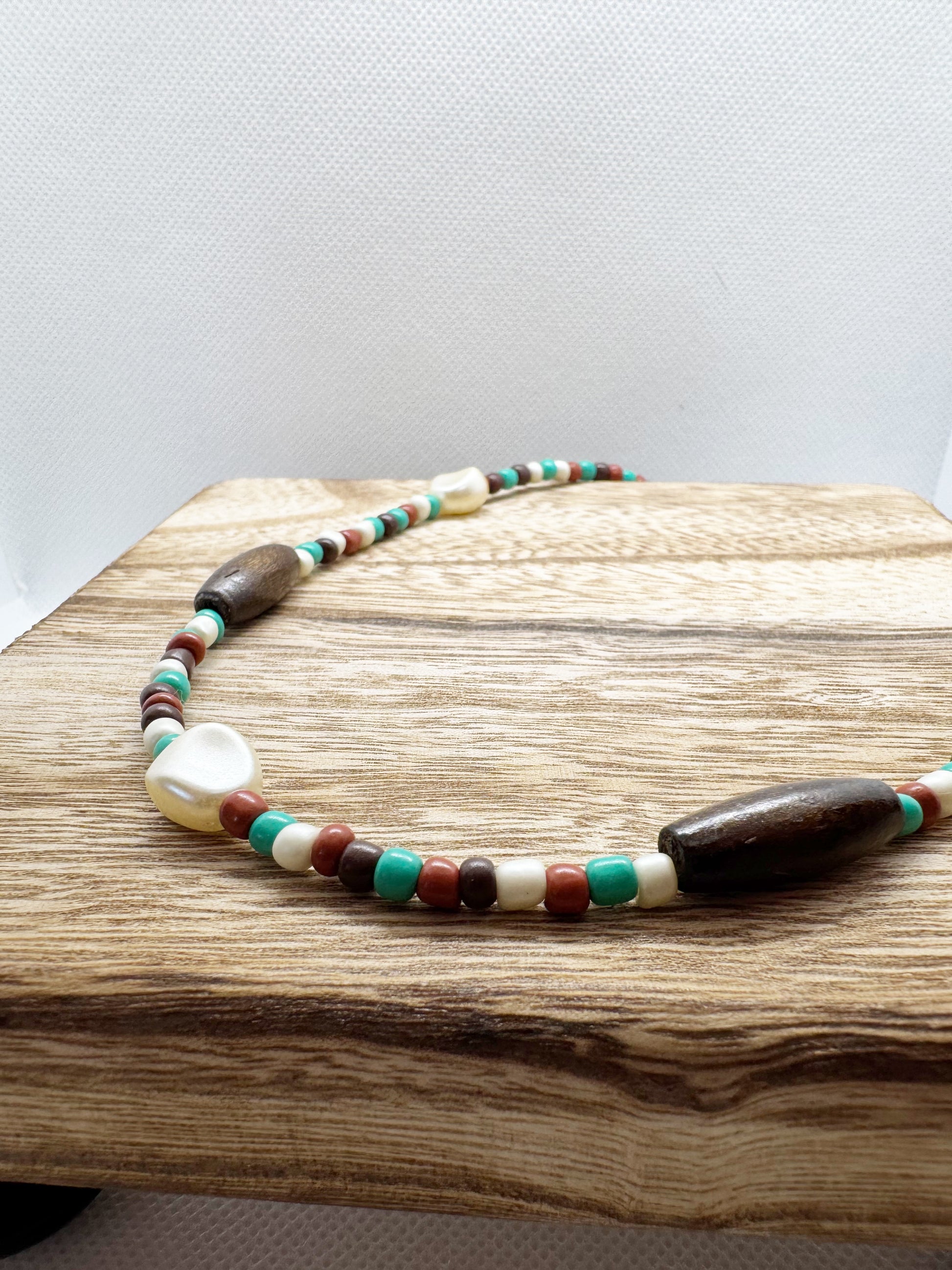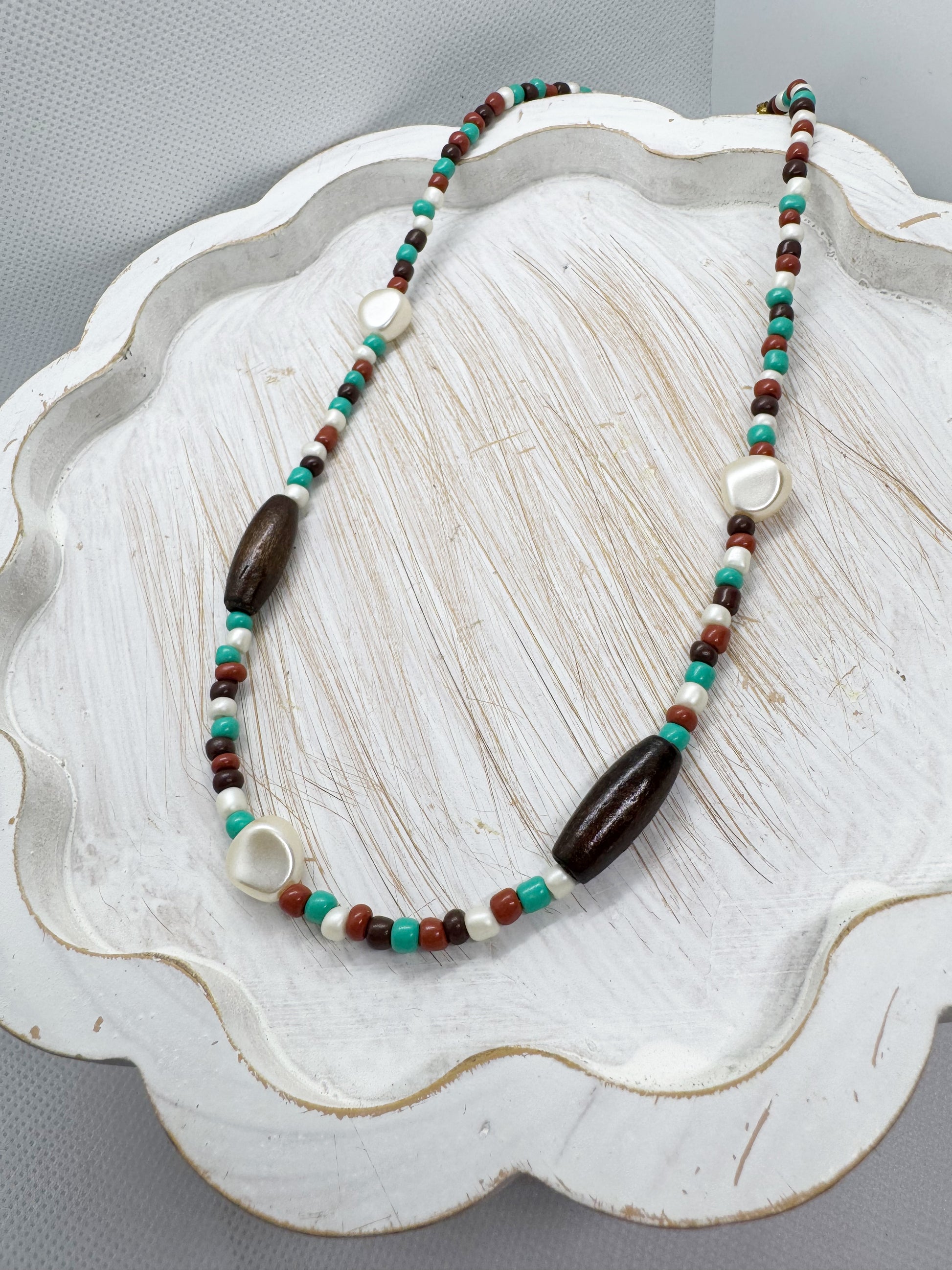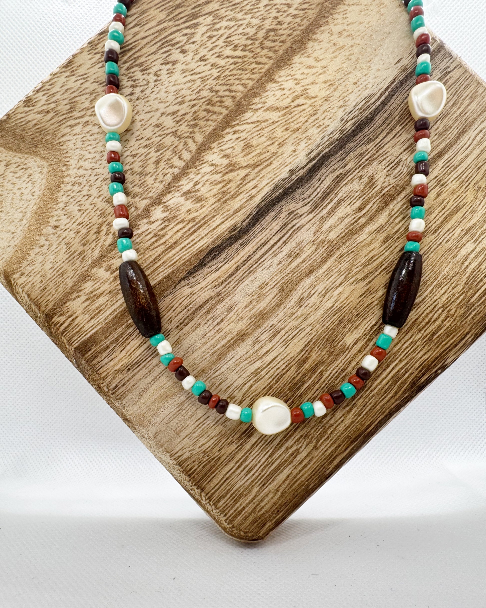 This handcrafted beaded necklace features a vibrant mix of turquoise, deep brown, rust, and pearl-toned beads, and polished wooden elements. Its unique combination of natural materials and earthy colors makes it a perfect accessory for a boho-inspired or beachy look
